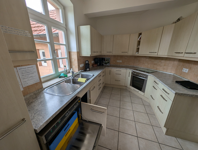 Im Sommer kann (bis 22 Uhr) auch im Freien gefeiert werden. Die Küche ist modern eingerichtet. Gläser, Geschirr und Bestecke sind vorhanden, ebenso ein Geschirrspüler.